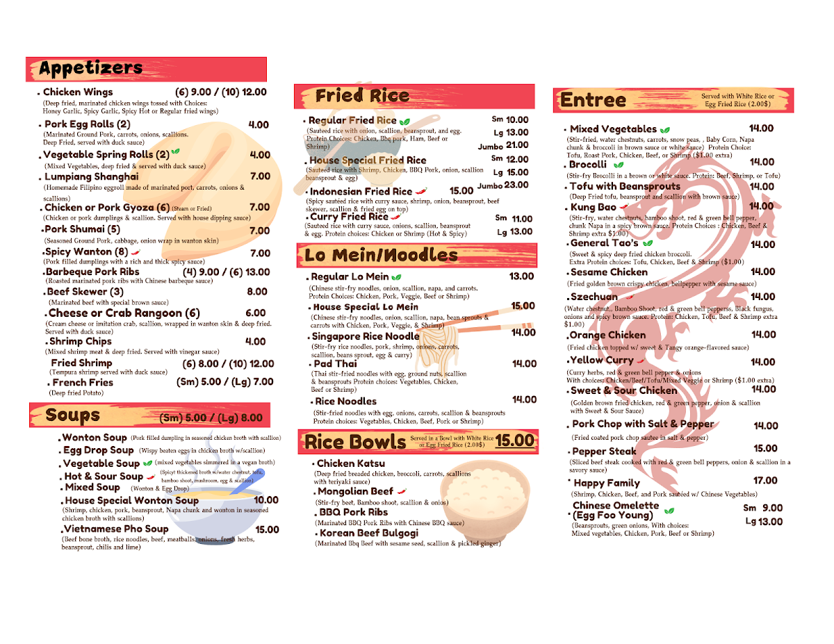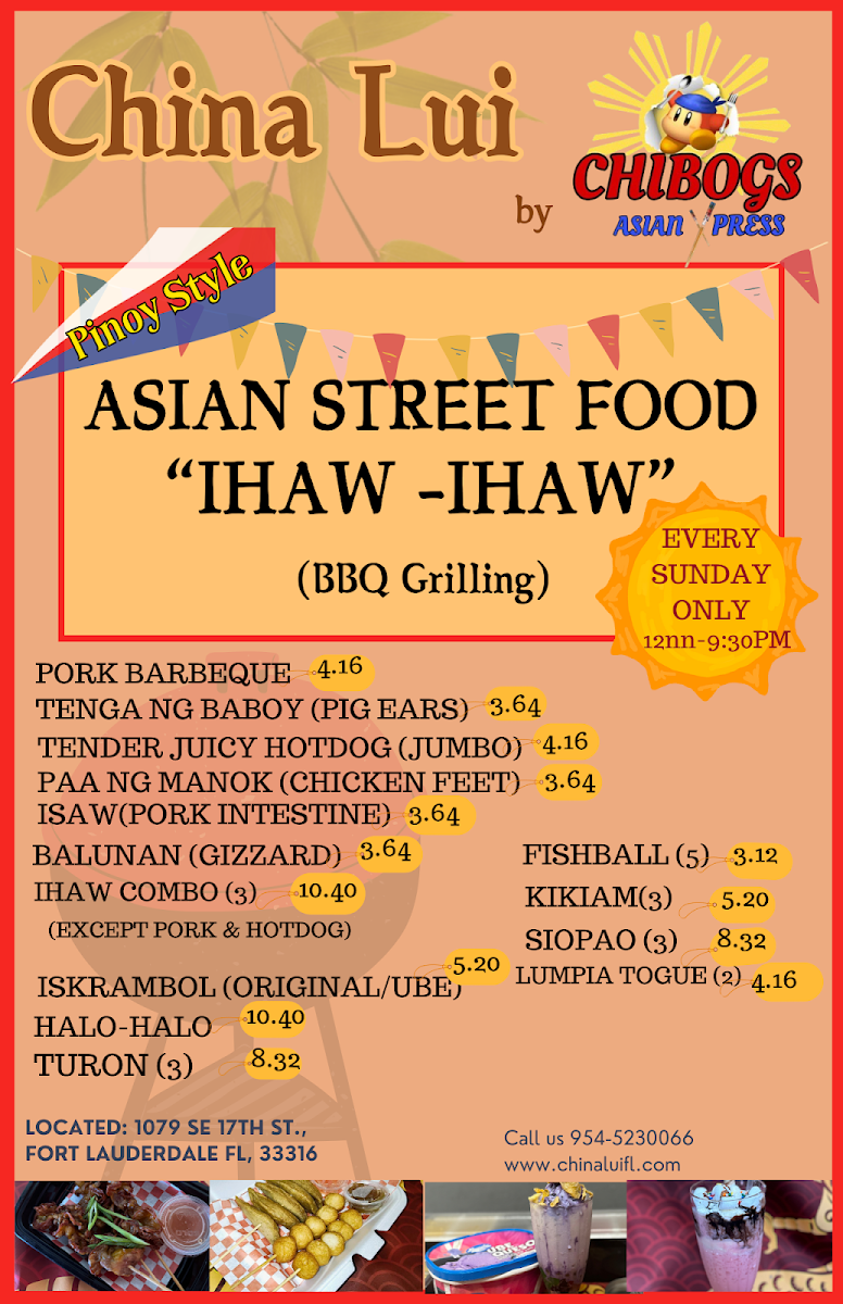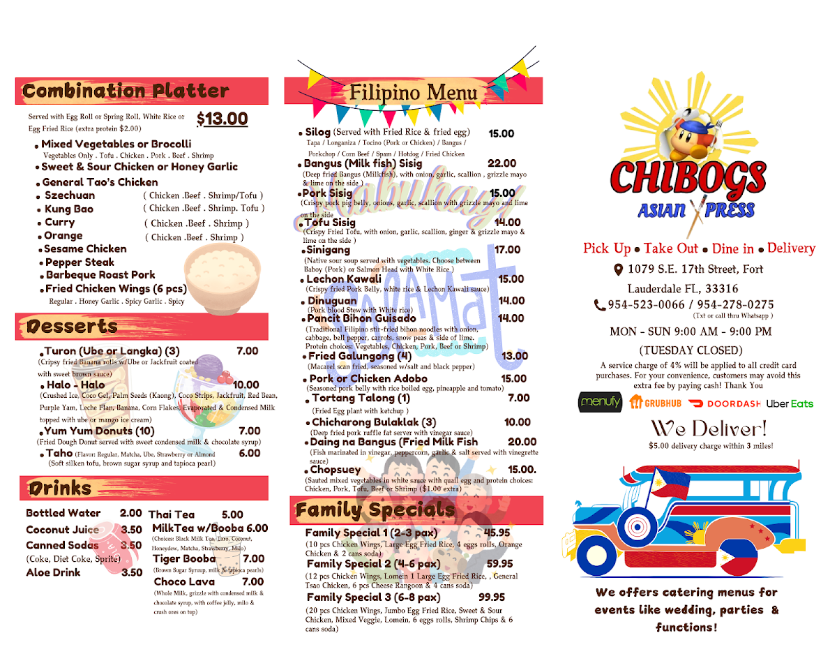 Chibogs Asian Express offers a diverse and flavorful menu with a blend of traditional Asian and Filipino dishes. For appetizers, diners can enjoy crispy Pork Egg Roll for $2, Spring Rolls (2 pieces), or indulge in savory Cheese Rangoon (6 pieces). If you're in the mood for wings, their Fried Chicken Wings (6 for $6) or Honey Garlic Wings (6 for $7) are standout choices. The menu also features a variety of fried rice options, including Vegetable Fried Rice ($7) and Chicken Fried Rice ($9), as well as hearty dishes like Kung Bao Chicken and Sweet Sour Chicken. Seafood lovers can enjoy dishes like Shrimp Broccoli or General Tao's Shrimp. If you prefer something comforting, the Egg Foo Young comes in both small and large sizes, with options like Vegetable Egg Foo Young starting at $6. Filipino favorites like Pancit Bihon Guisado and Lechon Kawali bring extra flavor to the menu, while unique sides like Sesame Balls (8 pieces for $4) offer a sweet ending. For a more filling option, try the Rice Bowl selections, such as Chicken Katsu or Mongolian Beef Bowl. The restaurant also features refreshing drinks like Thai Tea w/Booba and traditional Filipino snacks such as Turon Langka (3 pieces for $5). Whether you're craving something savory or sweet, Chibogs Asian Express has a satisfying dish for every taste.