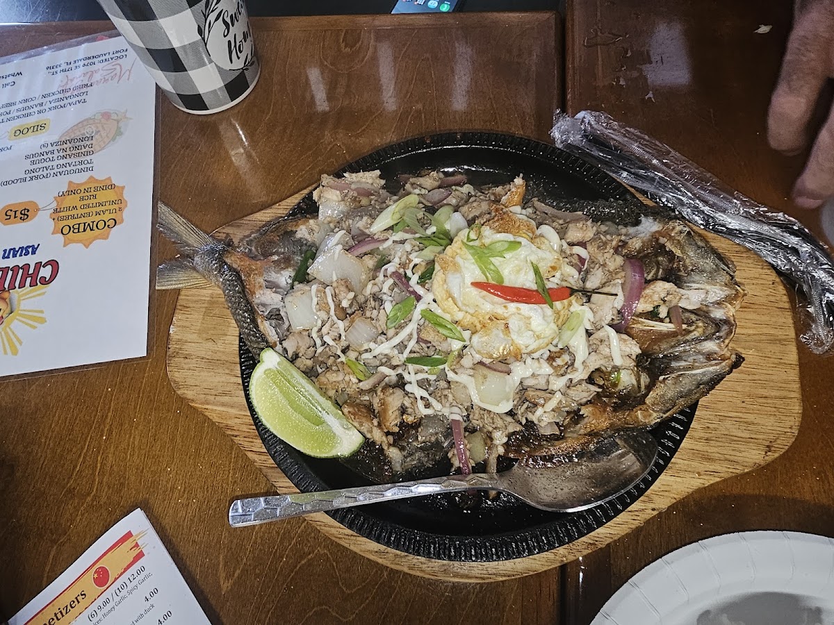 Whole boneless Bangus (Milk Fish), onions & garlic. Grizzle with mayo and lime chili on the side